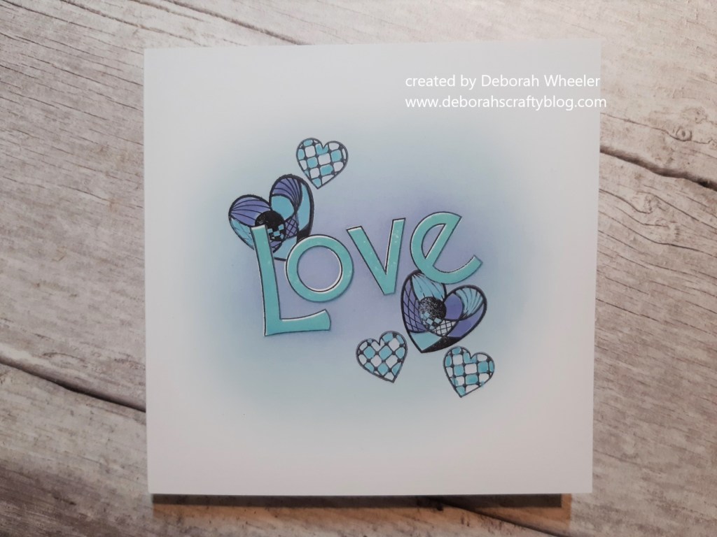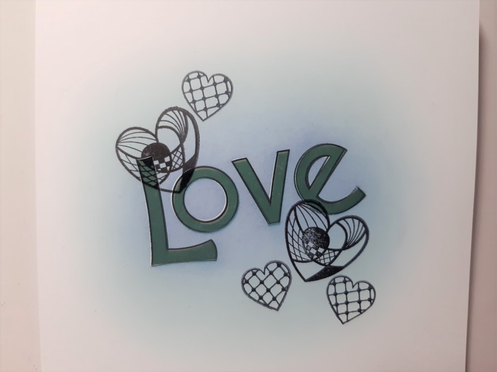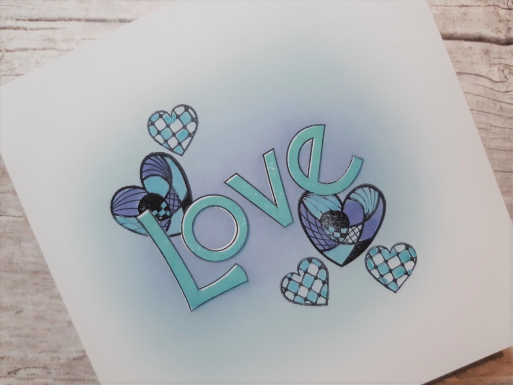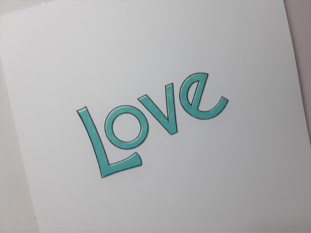 I started by stamping the ‘love’ outline in black Archival onto a 6×6 card blank, and then added the infill stamp with ‘salvaged patina’ Distress Oxide.