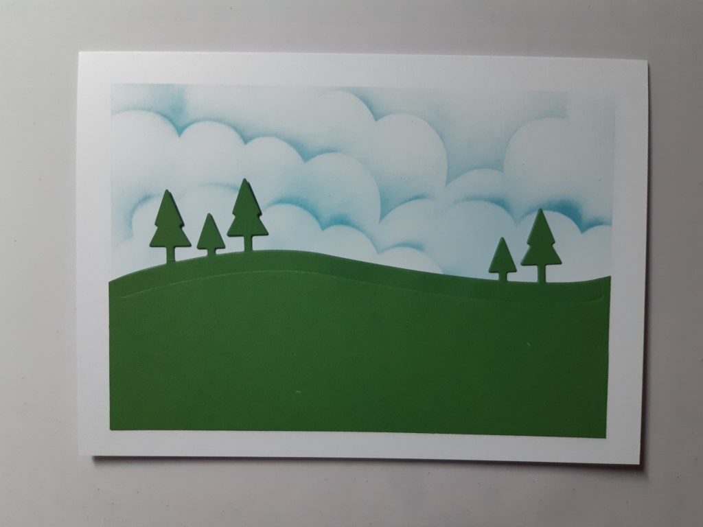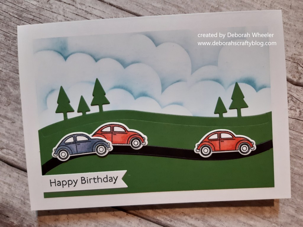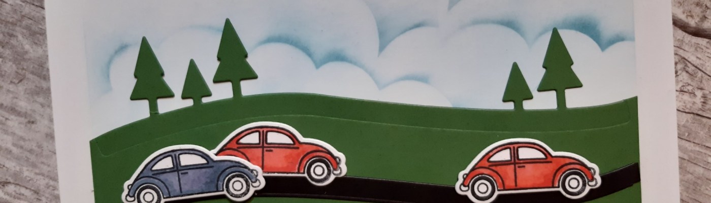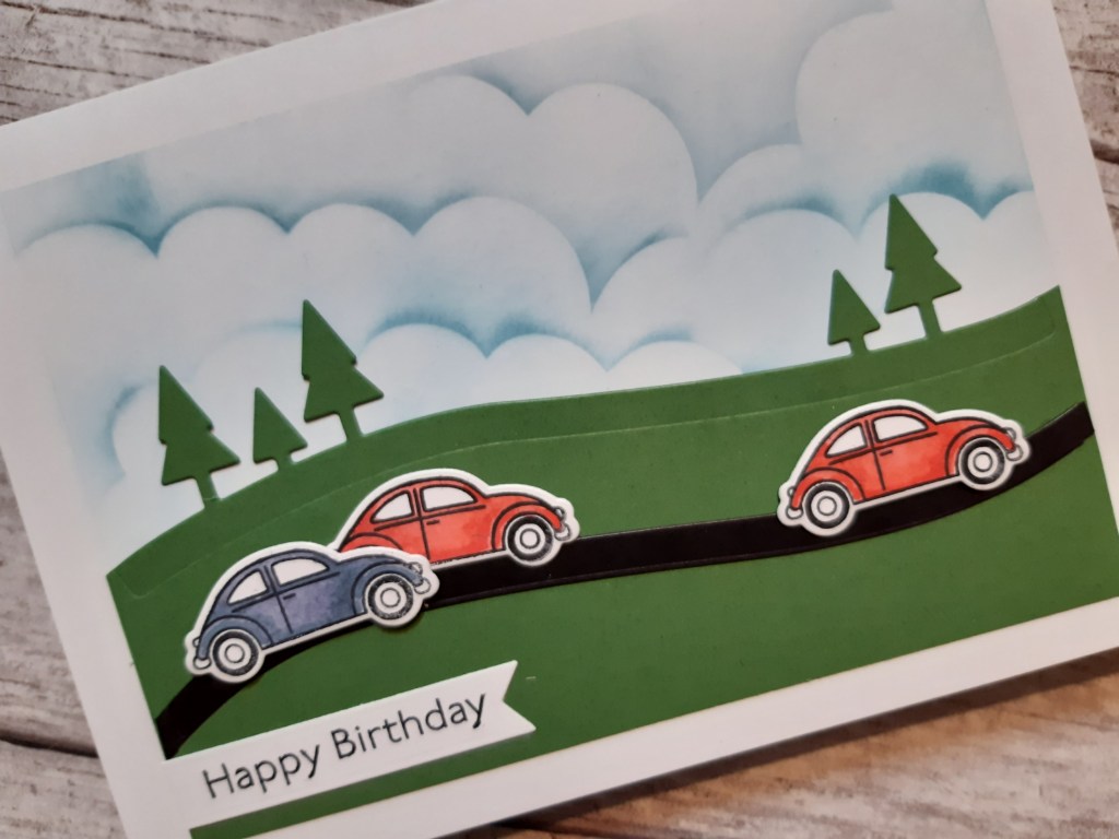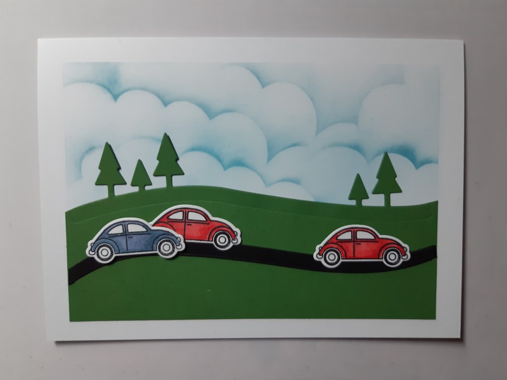 I love the little car in Stampin’ Up!’s ‘coming home’ set – it reminds of a couple of VW Beetles we had years ago. I need to make some more children’s cards and so thought it would be ideal. I started with a 5×7 card blank, masked a frame and then used Claritystamp’s cloud mask and a blending brush to create a cloudy sky with ‘broken china’ Distress Oxide. I used the tree die from the co-ordinating ‘home together’ set to cut the top edge of a piece of green cardstock and then attached that to the lower part of the card front.