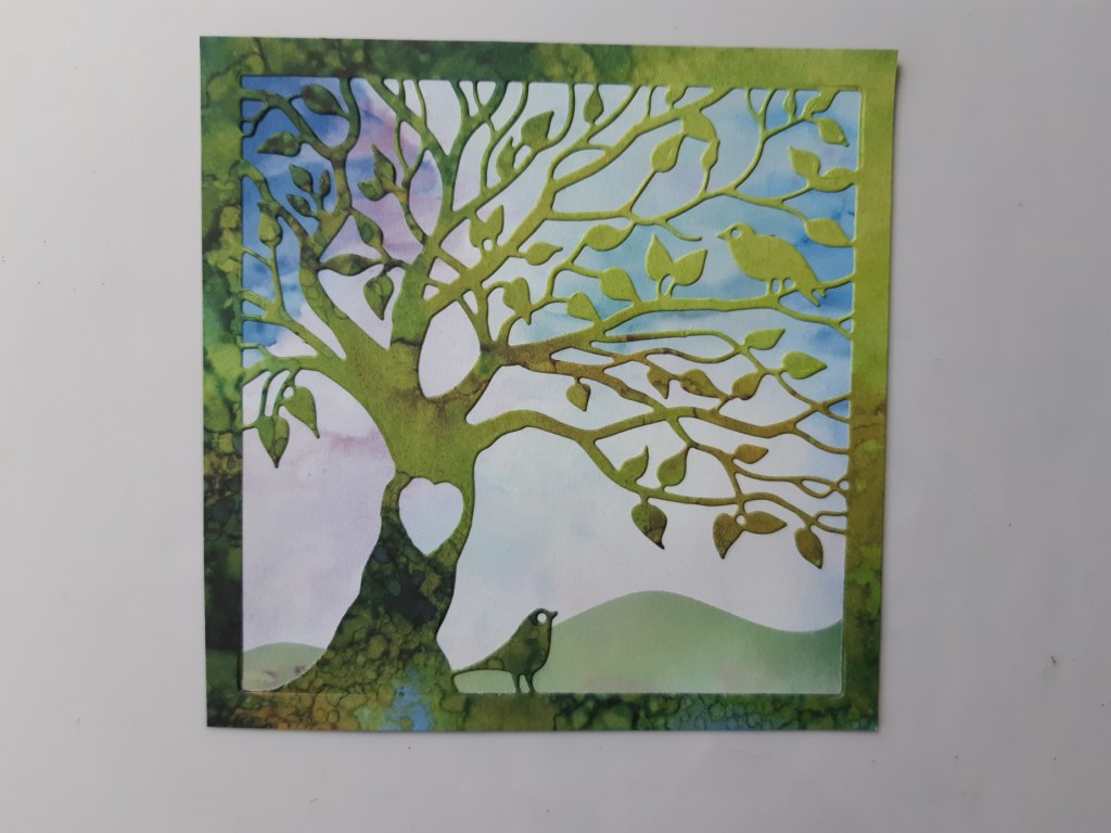 I attached the whole piece to a 6×6 card blank and stamped the sentiment along the lower edge in ‘rustic wilderness’. I wanted the two little birds to stand out a bit more, so ran a couple of little pieces from the ‘Antarctica’ back through the die, trimmed them off and glued them over the green ones.