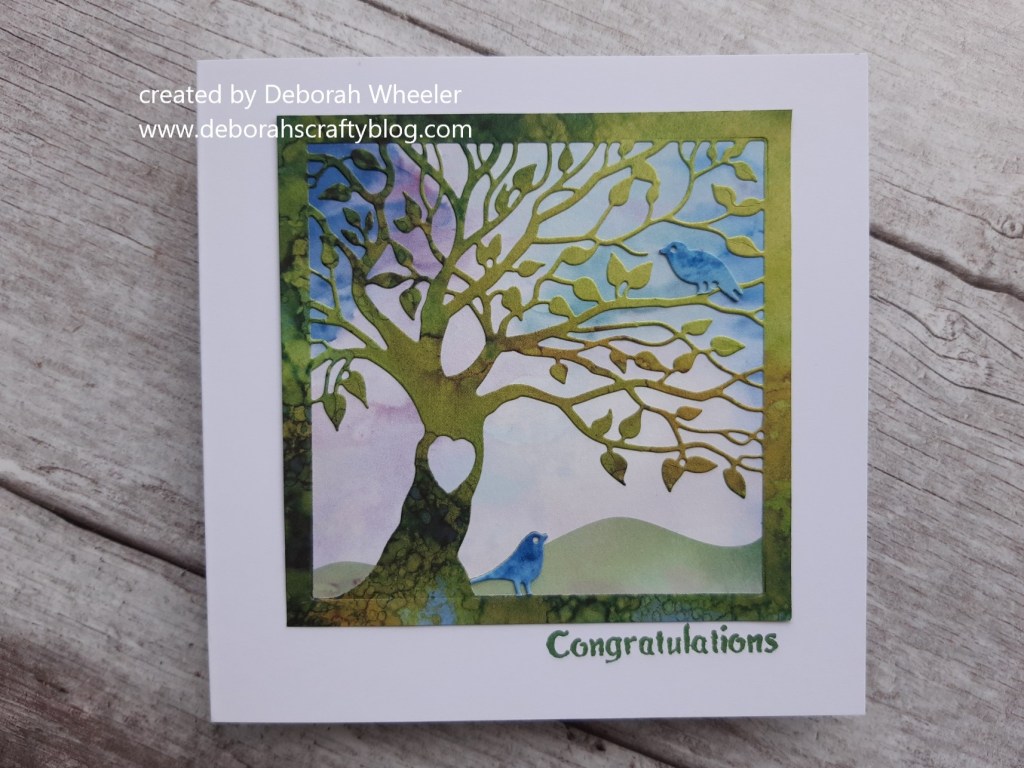 Hello crafty friends. I’m back with another wedding card today, this time using Claritystamp’s ‘the happy couple’ die. I’ve stepped it up a bit, thanks to the inspiration list from Festive Friday – I’ve picked up birds, trees, green and blue on the card.