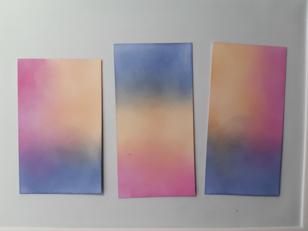 I then blended Distress Oxides in ‘chipped sapphire’, ‘picked raspberry’ and ‘dried marigold’ (the nearest I’d pot to GDP’s challenge colours) onto some scrap piece of white card, so that I could cut the ferns out of it. I mixed the colours round so that they would . spread nicely across the die cuts.