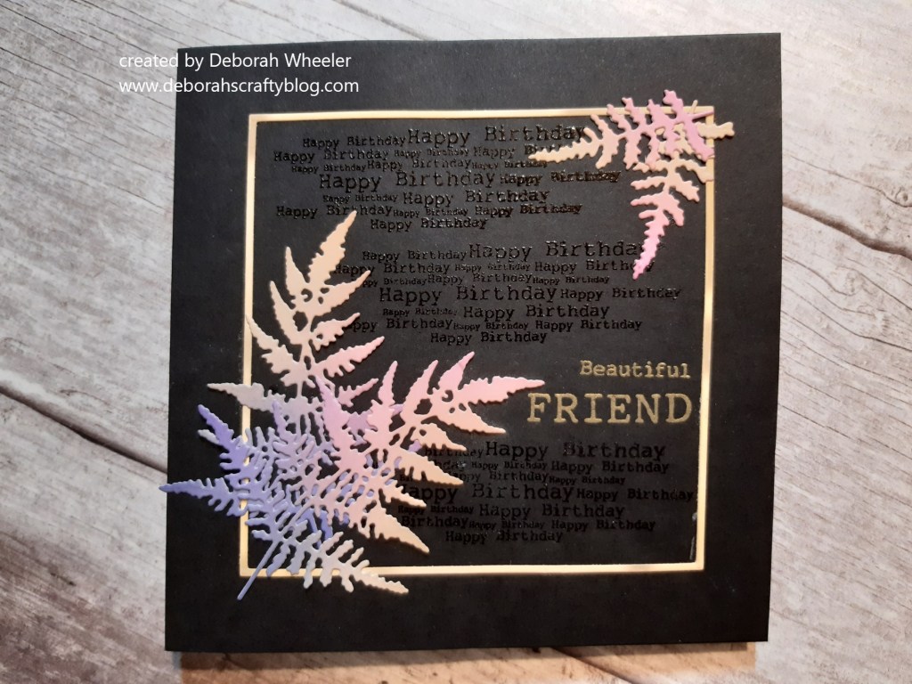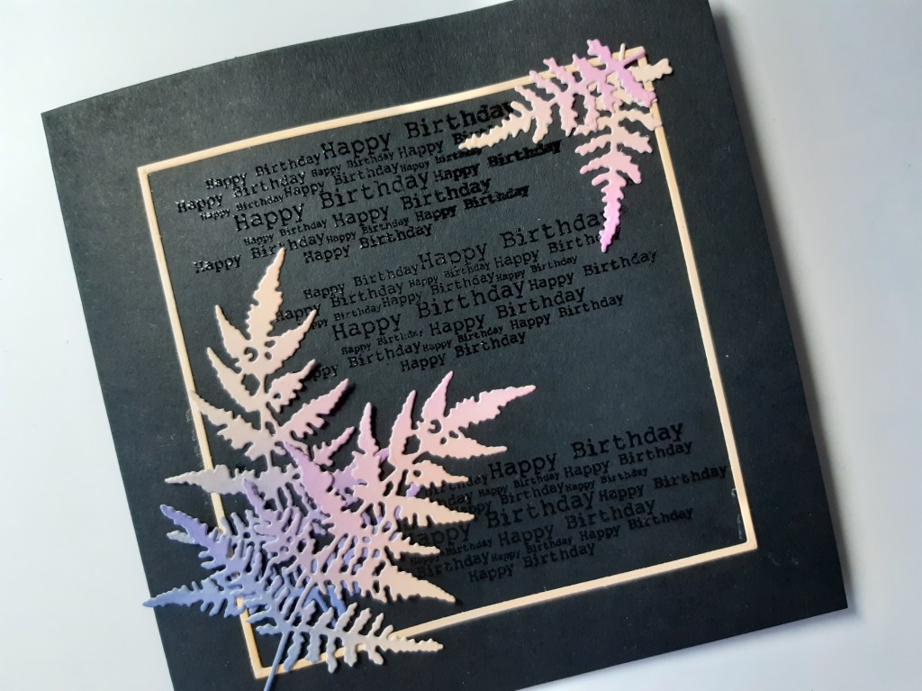 I cut two of the medium ferns and two small ones from the blended card pieces and then glued them onto the card front. I love how the colours look much more soft and muted than they appear on the whole pieces of card – I deliberately placed the dies across two or three colours to get a tonal effect.