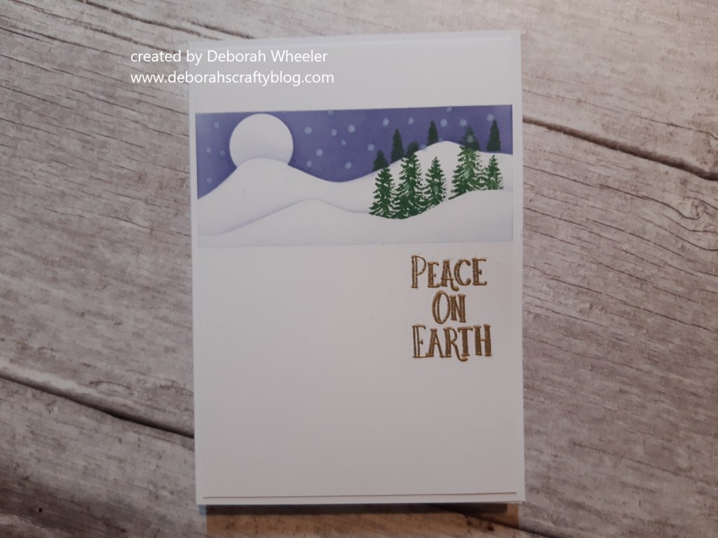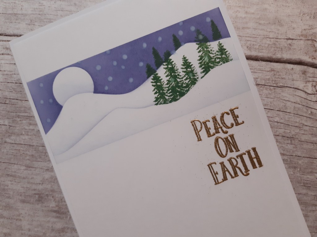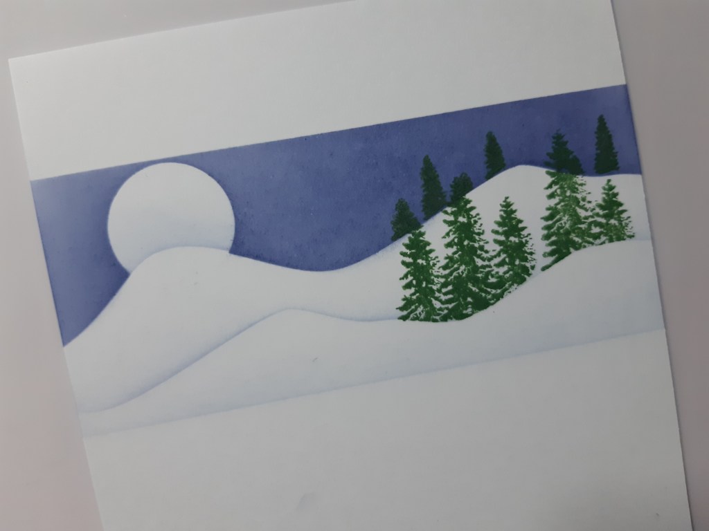 I love making little scenes on cards (a technique I first learned from Barbara Gray over at Claritystamp) and this one’s not too complicated so I can cope with it in my present Covid brain fog! I started by trimming a piece of white card to fit an A6 card blank and used Clarity’s hills and little moon masks to create the sky and snowy landscape by brushing ‘chipped sapphire’ Distress Oxide across them. I did the sky first, then moved the hills mask a couple of times to add a light dusting of ink for the snowy hills.