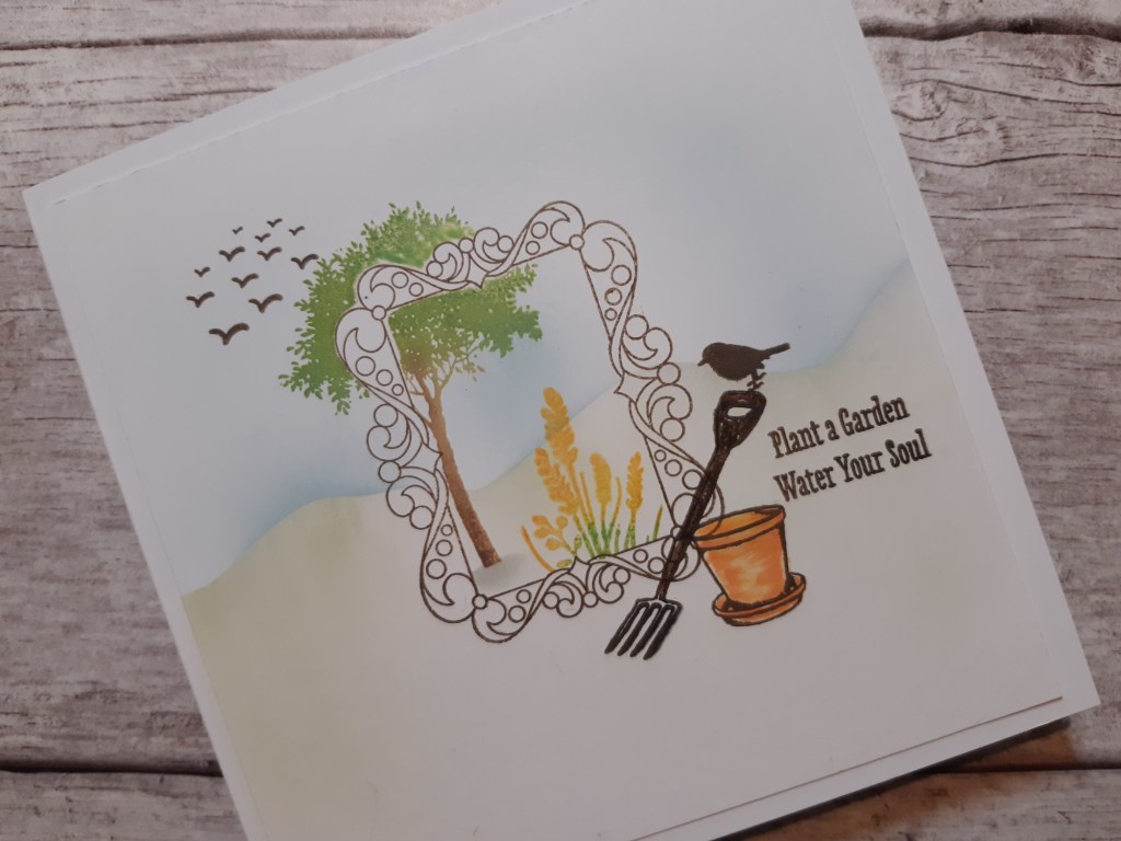 I finished by sitting one of the small birds on top of the garden fork and addded the flock of birds in the sky. The final touch was the sentiment from the ‘garden’ set, again stamped in ‘potting soil’, before ataching the whole piece to a 6×6 card blank.