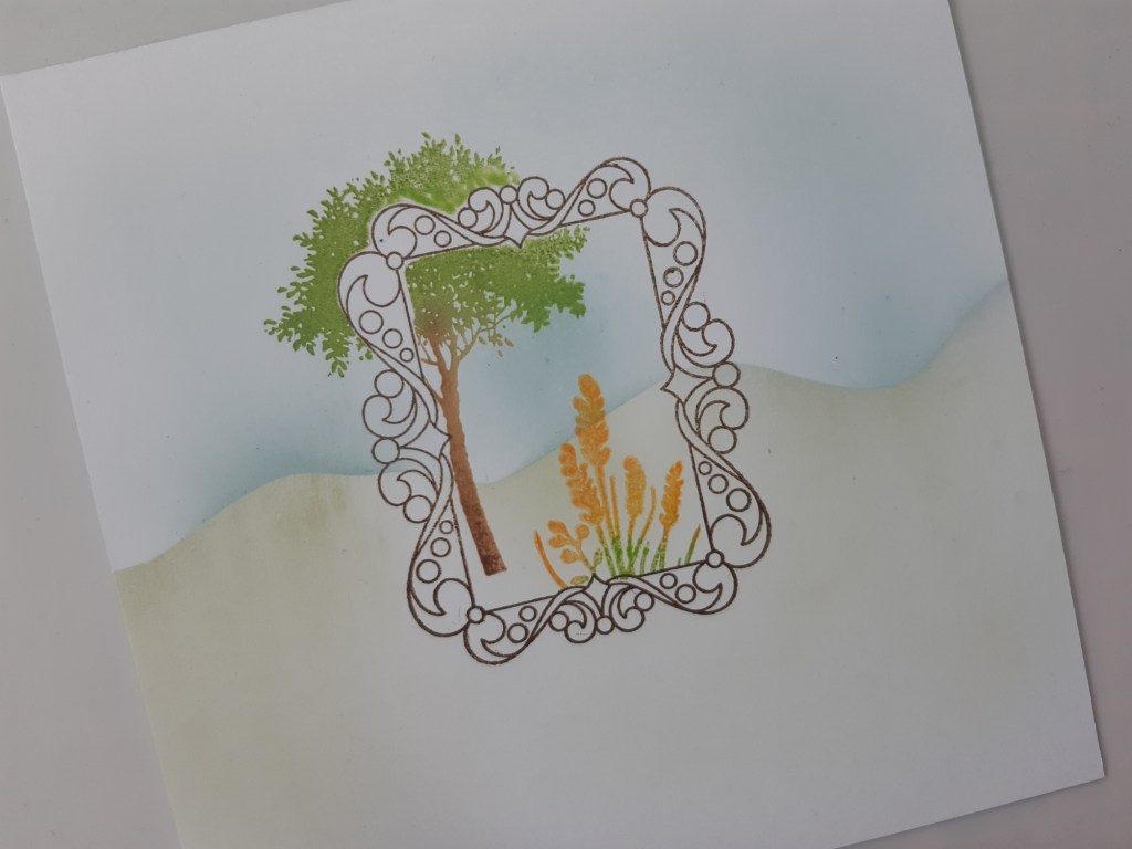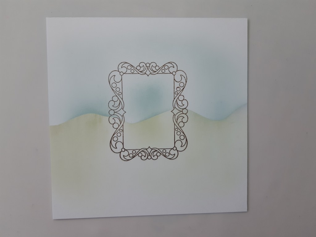 I started with a square of white card and stamped the frame in the centre using ‘potting soil’ Archival ink. I popped the hills mask over the top and brushed ‘bundled sage’ Distree Oxie onto the lower part of the card. I then used the other part of the mask to cover the ground and brushed ‘speckled egg’ into the sky.