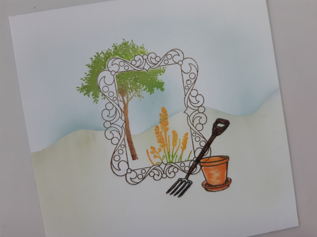 I stamped the garden fork from the ‘garden’ set to sit across the corner of the frame and coloured it with a brown Pergaliner pen. The plant pot sat next to it – I shaded it using a Pergamonao blending nib to add ‘ripe persimmon’ and ‘dried marigold’ so that it looked like terracotta.