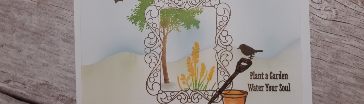 Hello crafty friends and welcome to my Sunday dip back into Claritystamp’s Craft Club. This ‘ornate frame’ stamp is from October 2018, and I decided to use it to create a little scene with some of the ‘garden’ stamp set.