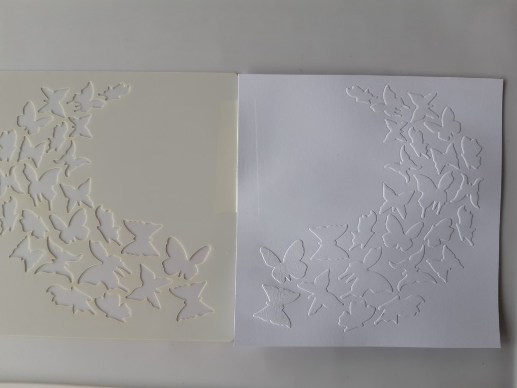 I started with a square of white card with the stencil attached, and used it as an embossing folder by running it through my Gemini machine with a rubber shim. It gvies a great rasied effect for the image.