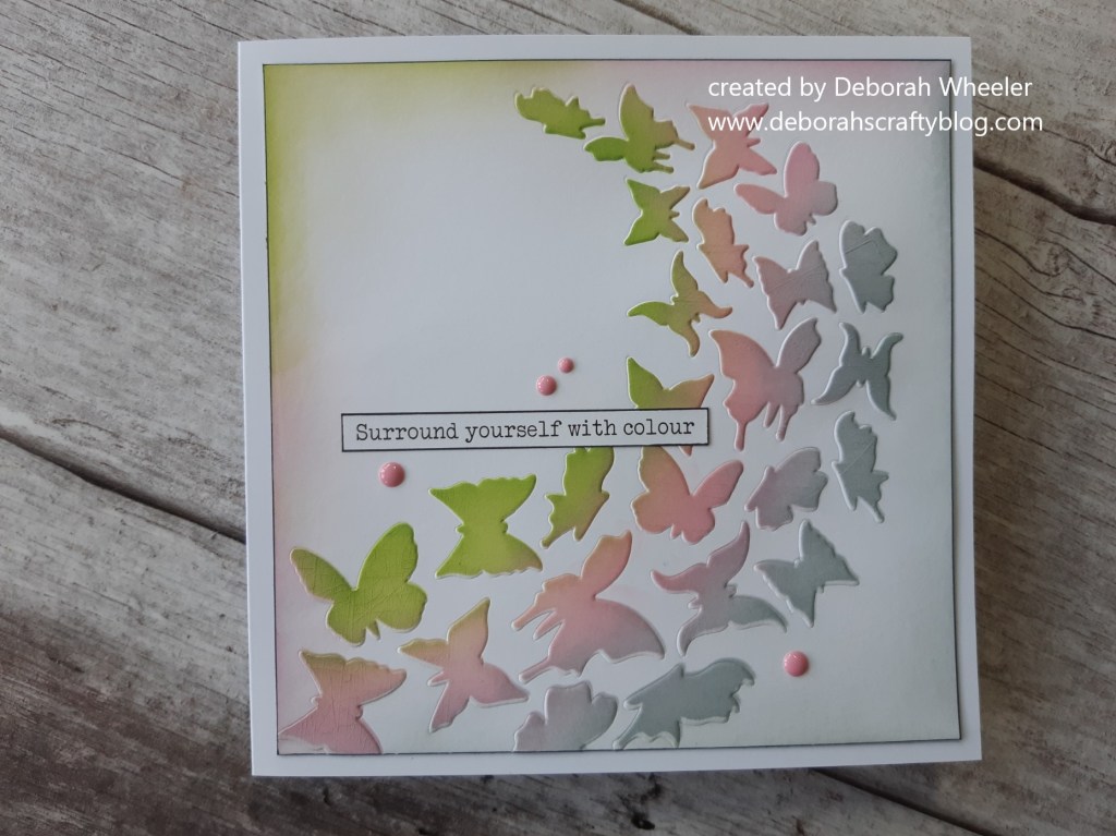 Welcome to my crafty blog. I’ve been playing today with the latest stencil from Claritystamp’s monthly Craft Club – this lovely wave of butterflies. I’ve used the colours from Color Thowdown and the embossing theme from Just Us Girls. I’m also going to share it as a second card for Inkspirational‘s ‘curve’ challenge.