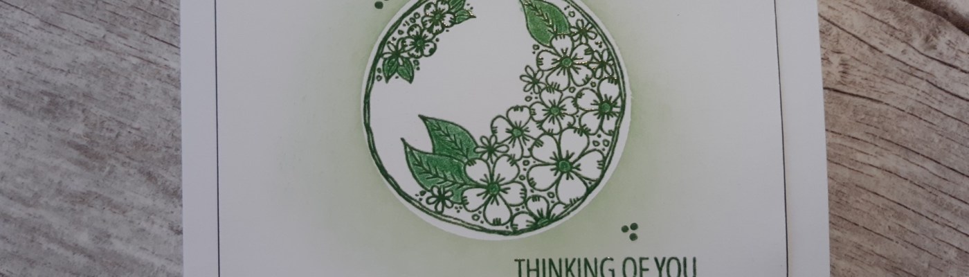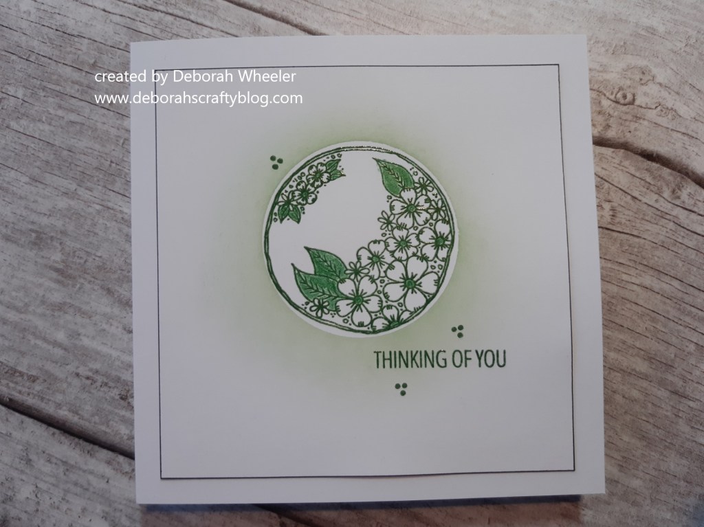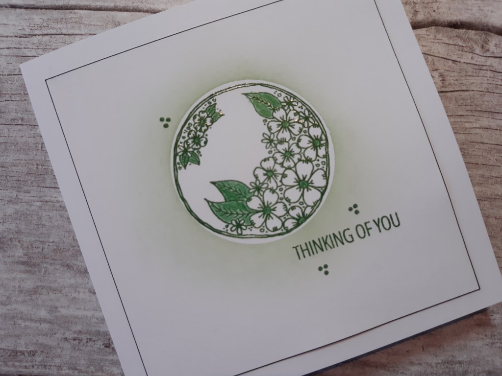 I then coloured in the leaves and the centres of the flowers with a green pencil. I cut a mask using one of Julie’s circle dies, covered the image and brushed ‘rustic wilderness’ around it.