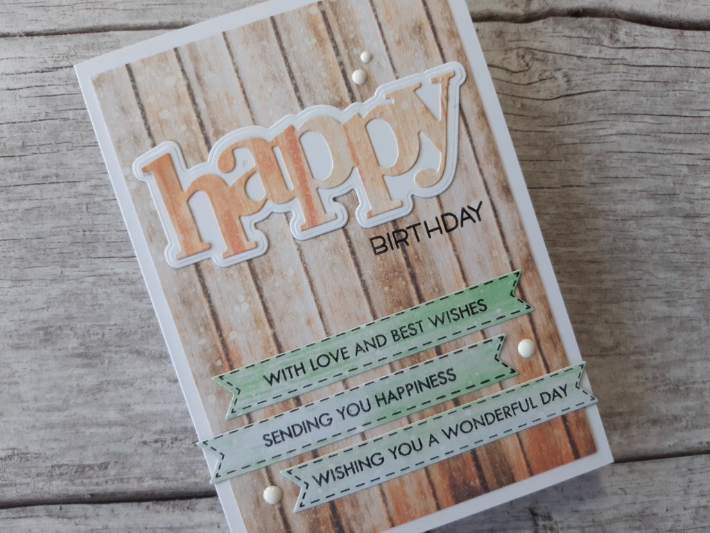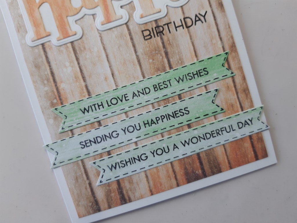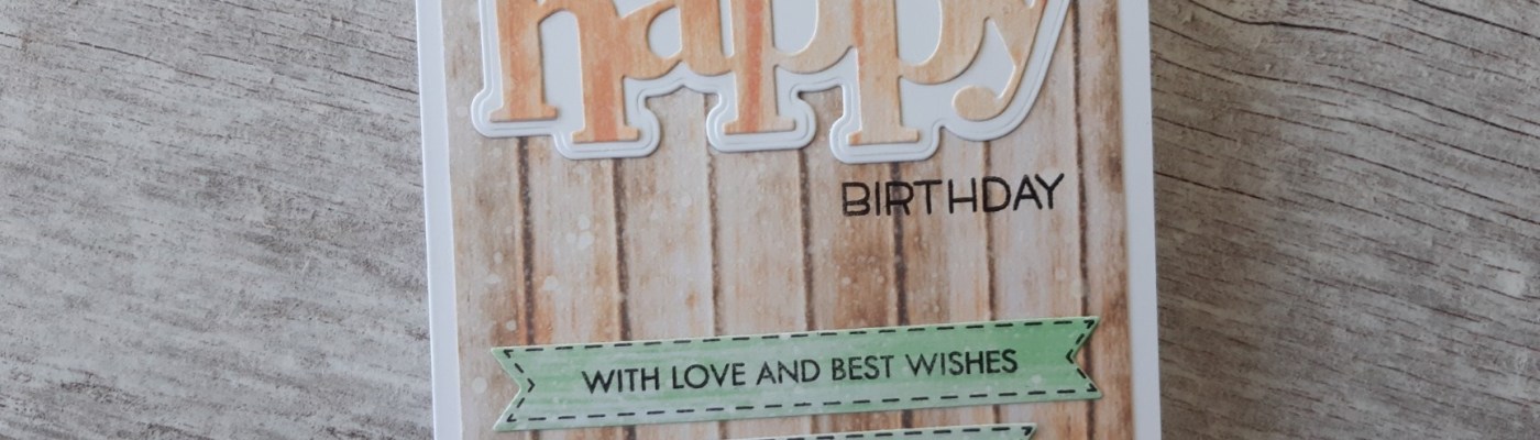 I statred by trimming down a piece of the orange & brown wood paper (using the darker side) and attached it to an A6 card blank. I die cut ‘happy’ from the orange side of the paper, glued it to a white mount and attached that to the card front. I then stamped ‘birthday’ below it.