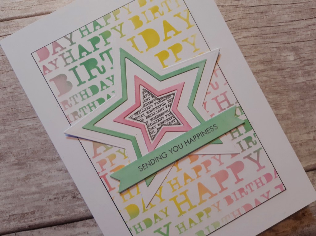 Welcome to my crafty bloig, and another card using the ‘happy birthday’ stencil and star dies from Julie Hickey Designs. I’ve used the colours and sketch from CAS Colours and Sketches for this one – it’s such a pretty palette, although mine is a bit more muted than the challeneg colours as I don’t have the SU shades, but hopefully it will be OK.