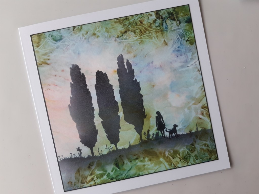 I stamped the woman and dog from the ‘family miniatures’ set, again with the black Archival, then ran a black Sharpie around the card edges and attached it to a 6×6 card blank.