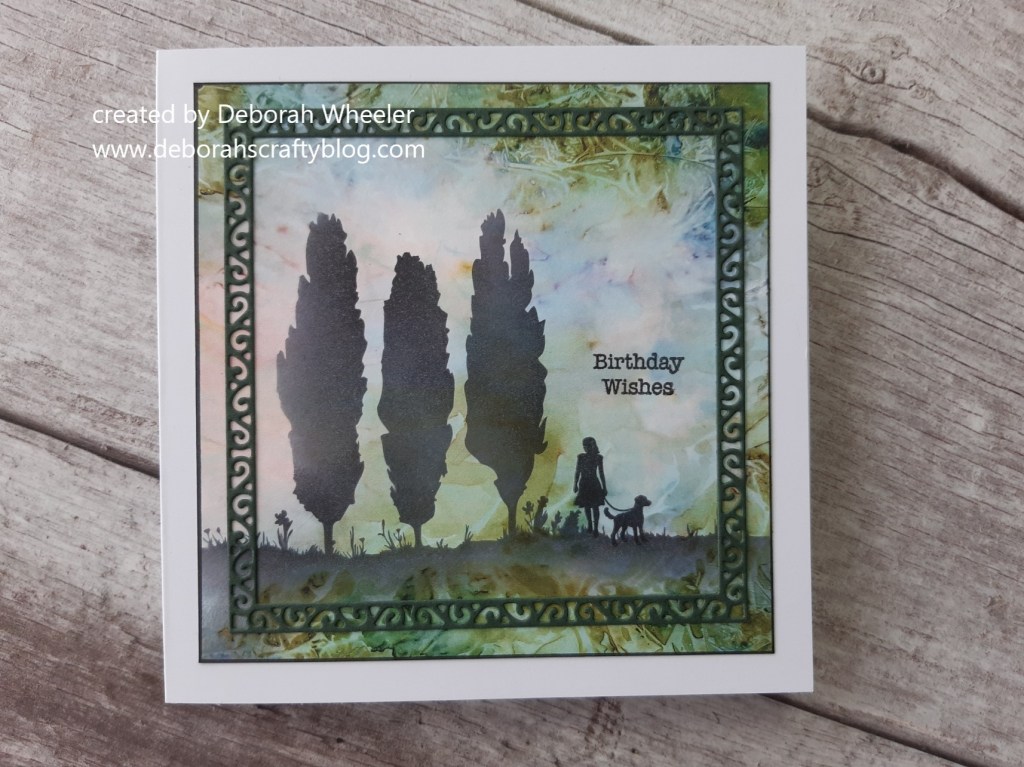 I started by trimming a piece of Clarity’s ‘Indian Summer’ designer card into a square, and popped the ‘riverside bank’ mask onto it. I then sponged black Archival ink through it to give me the landscape.