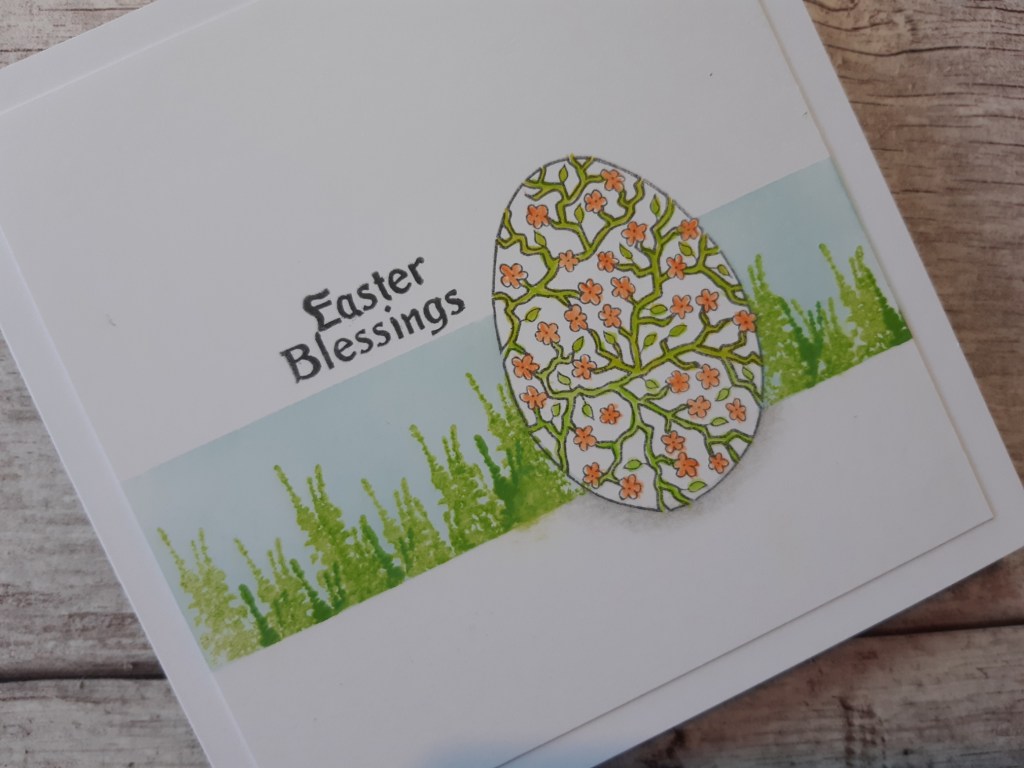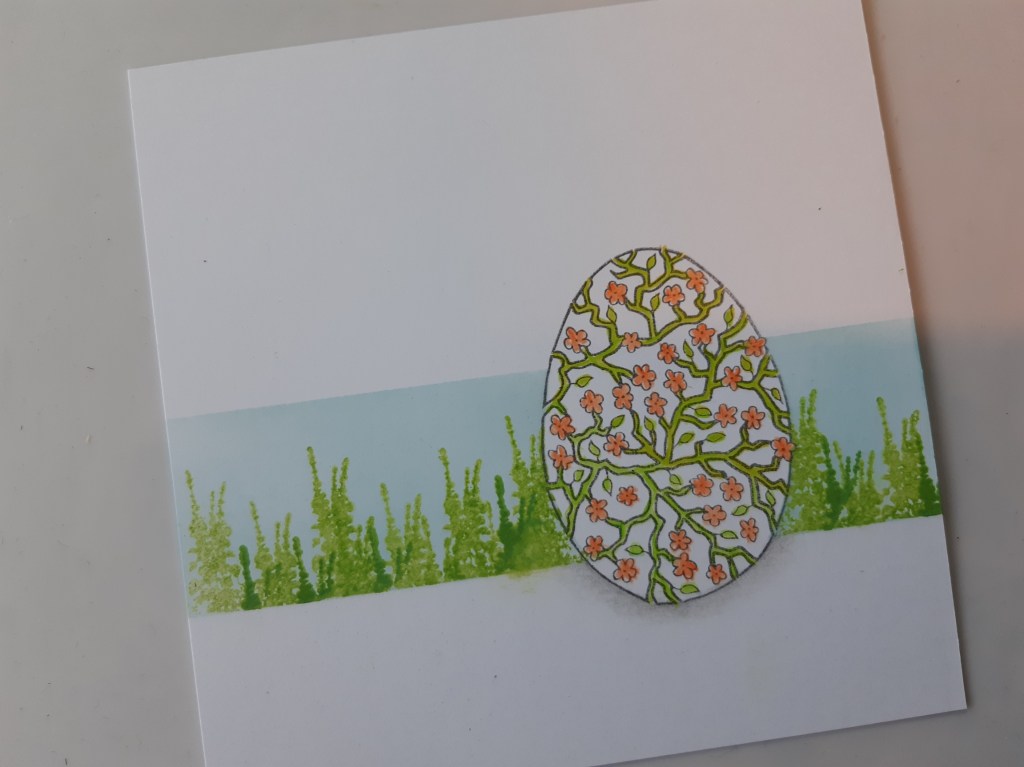 I started wiht a square of wite card and stamped the floral egg from the set in ‘watering can’ Archival ink. I then masked it off using the pre-cut mask that comes with the stamps and created a panel behind it with a couple of strips of low tack tape. I brushed ‘salvaged patina’ Distress Oxide across the panel before repeat stamping the shrub from the ‘garden miniatures’ set across it in ‘mowed lawn’ (I did this mainly in second generation to start with, then added a few in first generation to give a bit of depth).