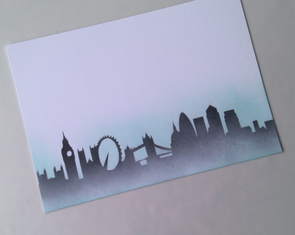 I started with a piece of white card, cut to fit a 5×7 card blank, and lined the upper part of the mask along it, adding in the extra pieces for the clockface on Big Ben, the centre of the London Eye and the sections of Tower Bridge. I then sponged black Archival ink downwards onto the mask, leaving the image lighter at the base.