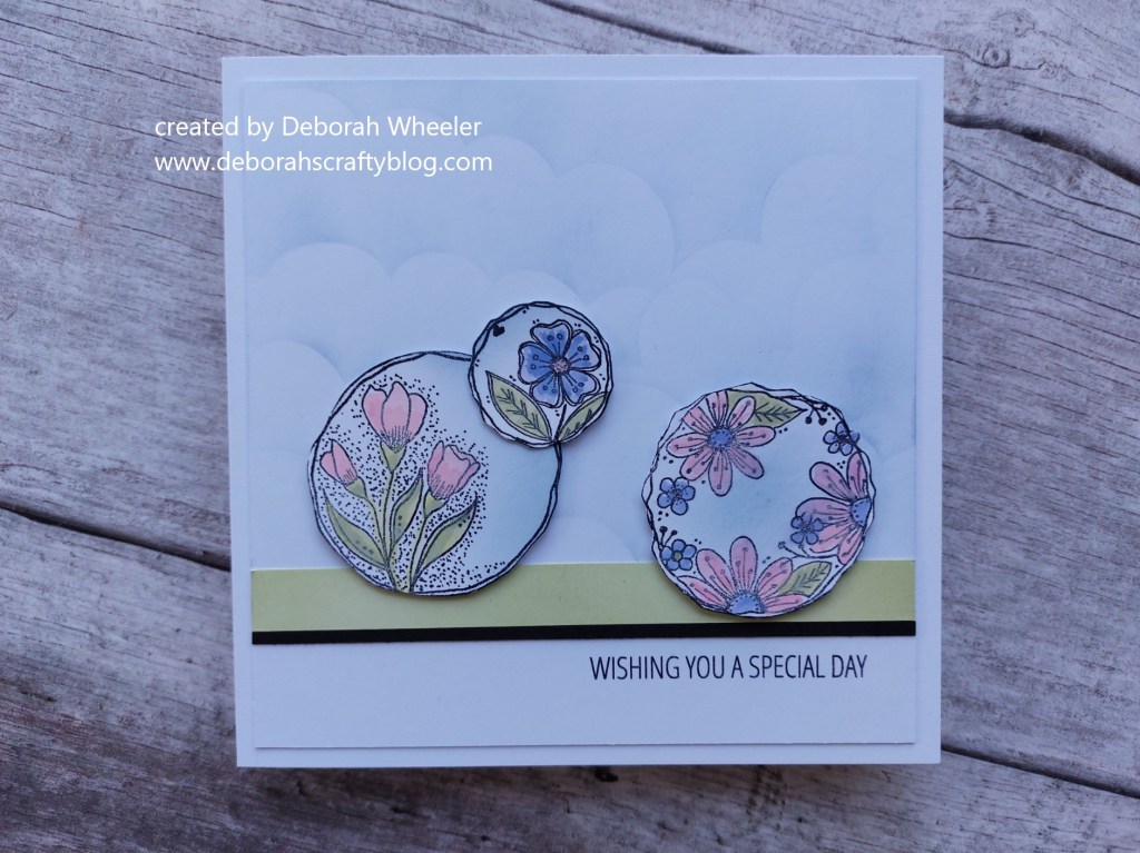 Your flowery circles are so sweet and I love the cloud background! Pretty card! Glad you joined us at FMS!