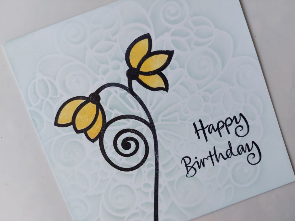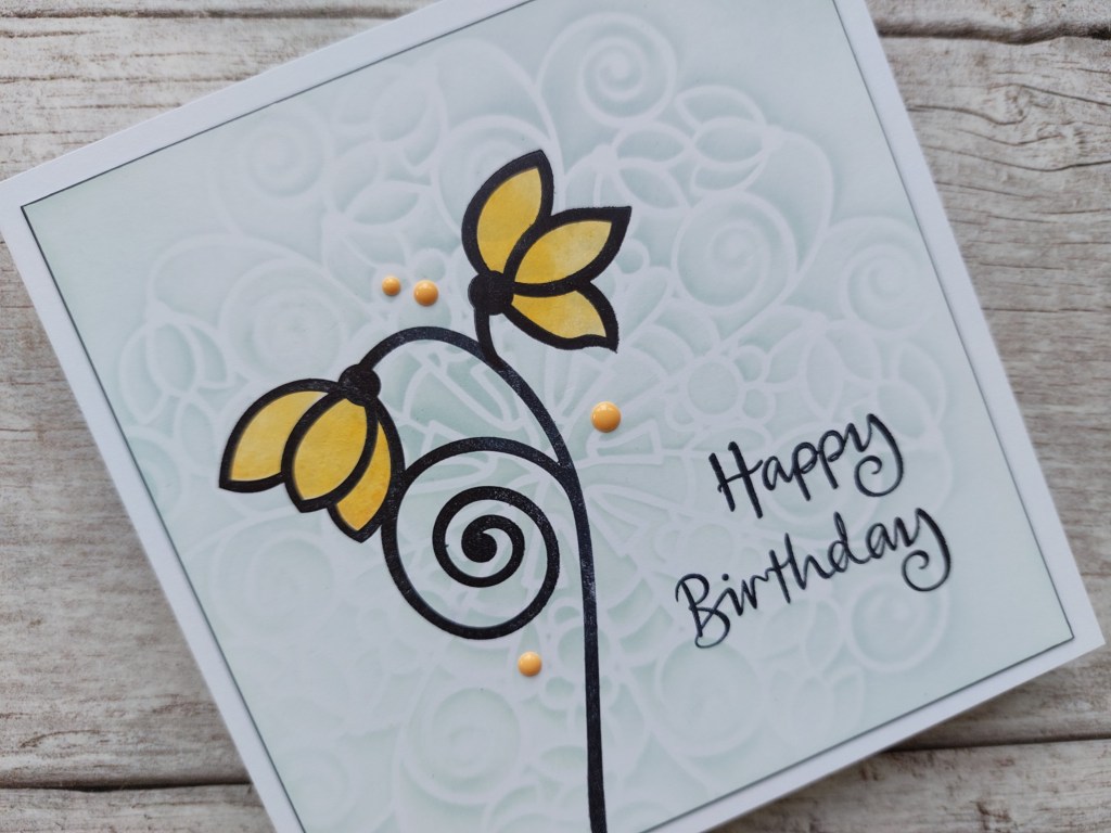 I then stamped the large snowdrop in black Arcival ink, adding in the second flower on the right. I used the two infill stamps in the set to add ‘dried marigold’ Distress Oxide to the petals, and then stamped the sentiment to the right.