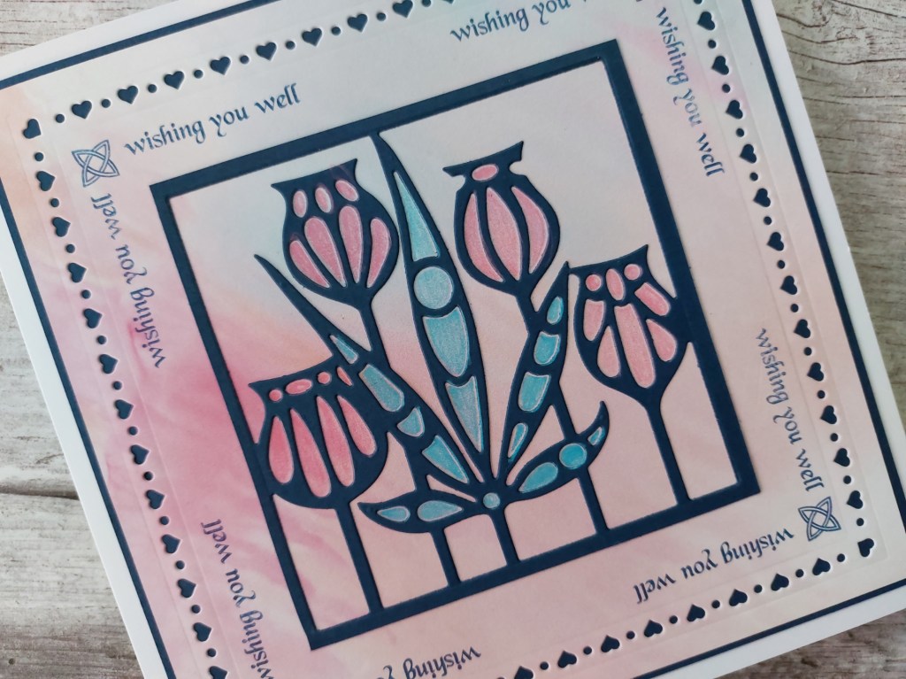 I stamped the ‘wishing you well’ corner sentiment into each of the corners in ‘cobalt’ Archival ink, masking off the Celtic knot at the end of the sentiment each time. I should have done this before attaching the paper to the card, but got away with it! I popped ‘Stick It’ adhesive layer onto the back of a square of the navy card, due cut the ‘funky foliage’ into it and then stuck it in the centre of the card front.