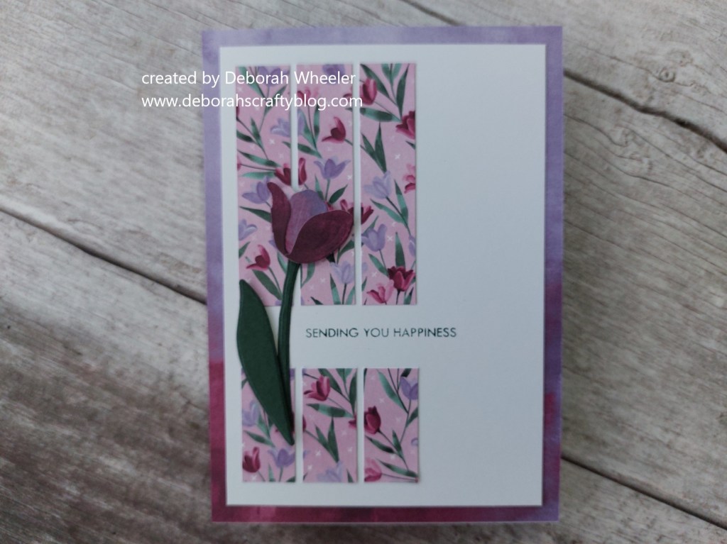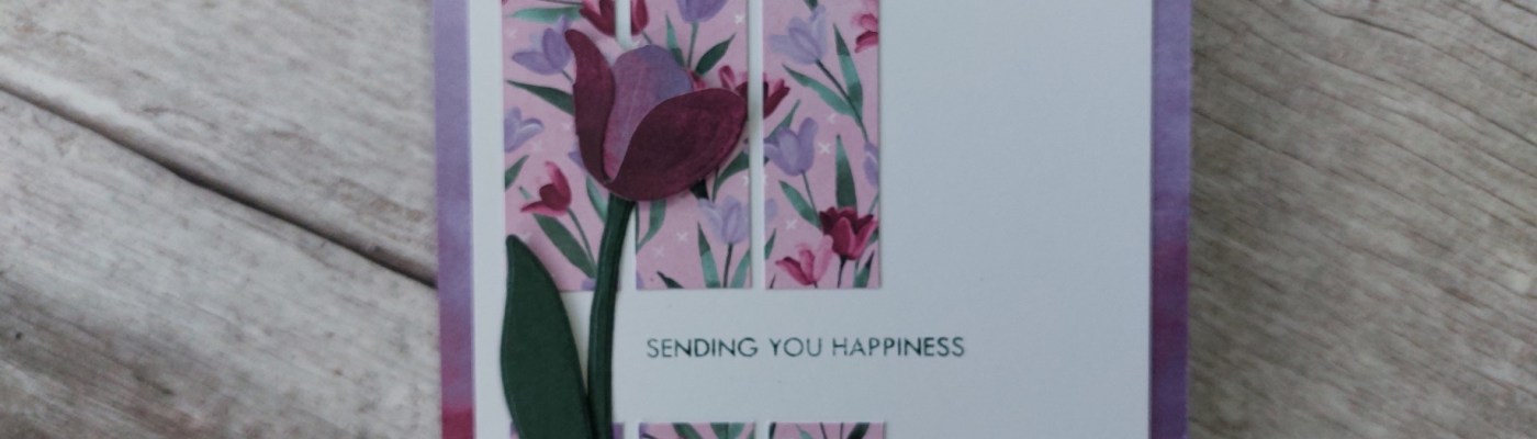 I then trimmed three strips of the tulip patterned paper and chopped them in two about 1/3 from the bottom. I glued them onto a piece of white card, using a ruler to make sure I’d got them all level with each other. I then stamped the sentiment from Julie Hickey’s ‘stitched banner & sentiments’ set into the gap using SU’s ‘evening evergreen’. The topper then went onto the card front.