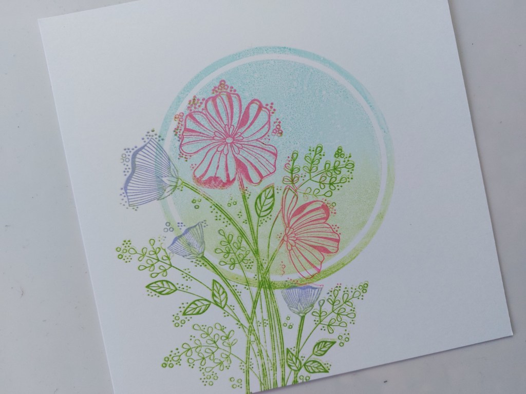 I then stamped the ‘meadow flower spray’ over it. Now I wanted the colours of the line art to match the shading, so I used my stamping platform for this. I first inked it up with ‘mowed lawn’, but wiped it off the flower heads before stamping. I then added ‘picked raspberry’ & ‘shaded lilac’ to the flowers using a sponge and then stamped those into place.