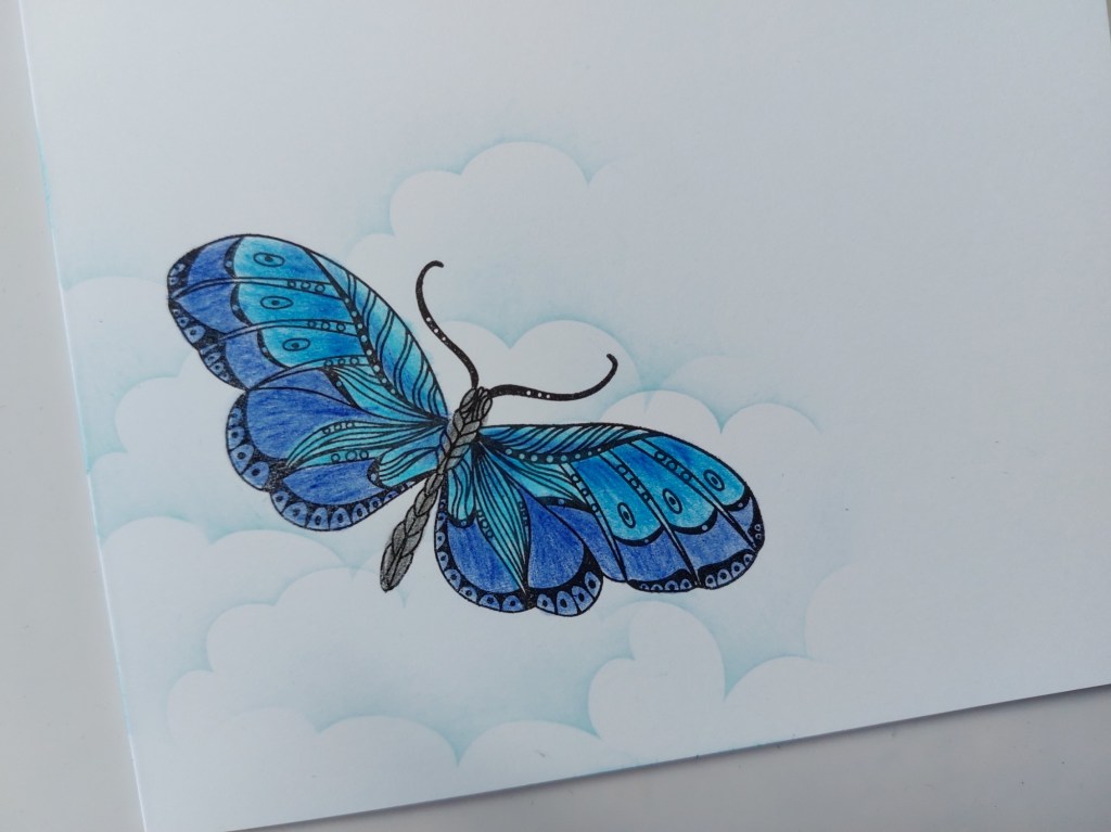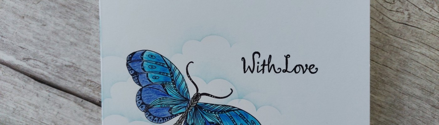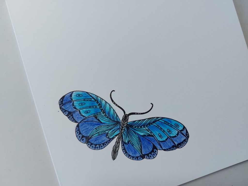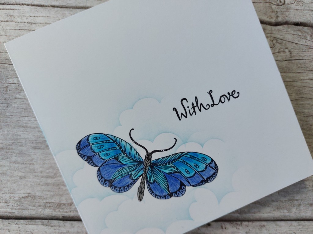 The first step was to stamp the butterfly (actually, it might be a moth!) onto the front of a 6×6 card blank. I then shaded it with three blue Pergaliner pencils, blending them together.