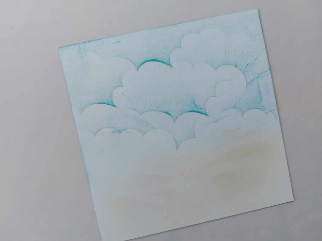 I started by blending ‘broken china’ Distress Oxide over the Clarity clouds mask onto a square of white card. I added ‘pumice stone’ at the bottom where the land is on the die – I sat the die on the card and brushed a little ink through it first to give me a guide, then addded some more without the die. It looks a bit scruffy, but it is just going to sit in the background.