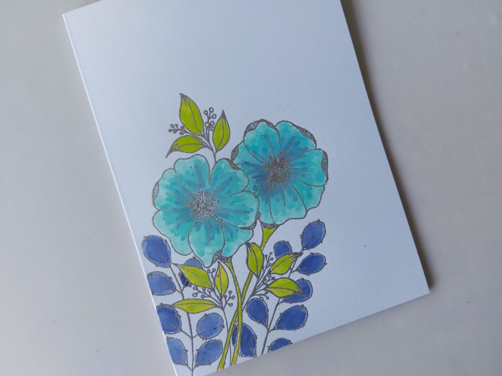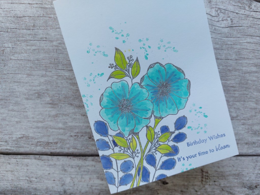 I coloured the image with a waterbrush and Distress Oxides in ‘salvaged patina’, ‘twisted citron’ & ‘chipped sapphire’. I added strokes of navy to the centre of the flowers to give them a bit more depth, then blended the ‘salvaged patina’ back over them to soften the lines.