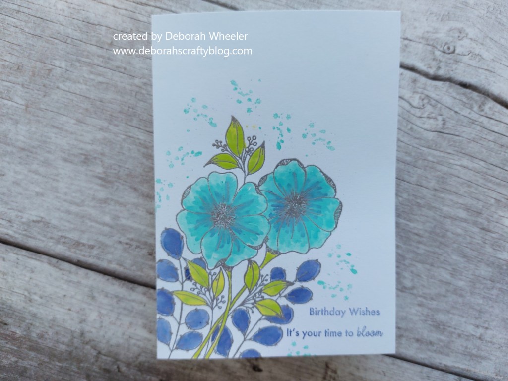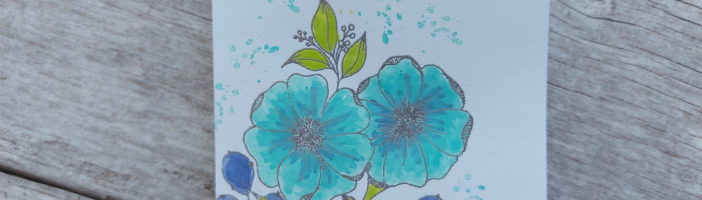 Hello crafty friends. Today’s card uses the ‘garden blooms’ set from Julie Hickey, which felt just right for a the beautiful sunny afternon we’ve had here. I’ve taken inspiration from a couple of current challenges – the colours (aqua, lime green & navy) are from Color Throwdown, paired with the theme of ‘no layers + plant/grow/farm’ from AAA cards