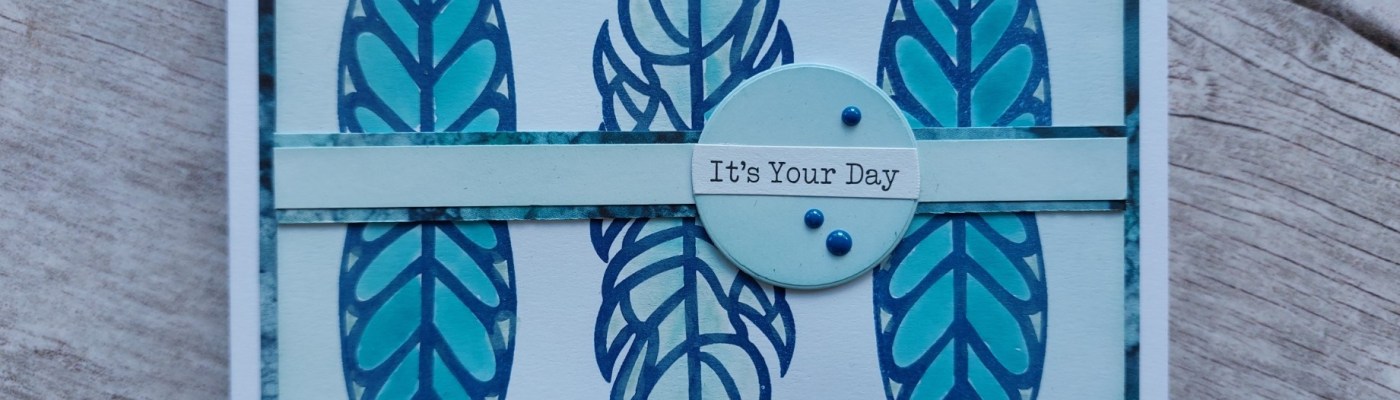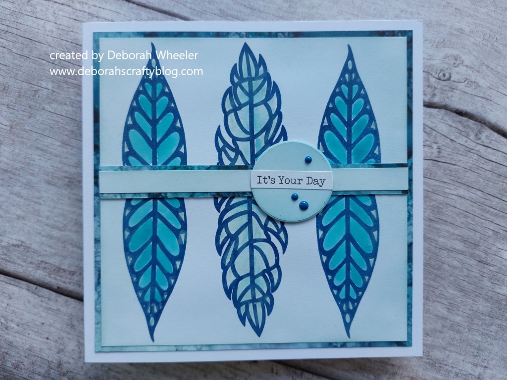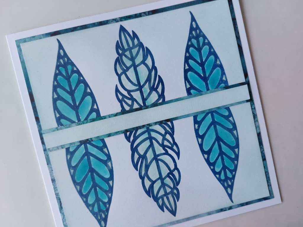 I started by stamping the leaves from the funky foliage set. They weren’t long enough to go the whole length of a 6×6 card, so I used a sticky note to maks the lower part of the card and stamped them in the top half first using ‘cobalt’ Archival ink. I then asked off where I’d already stamped and added the images again across the bottom. I coloured them in with a waterbrush and Distress Oxides in ‘broken china’ and ‘speckled egg’.