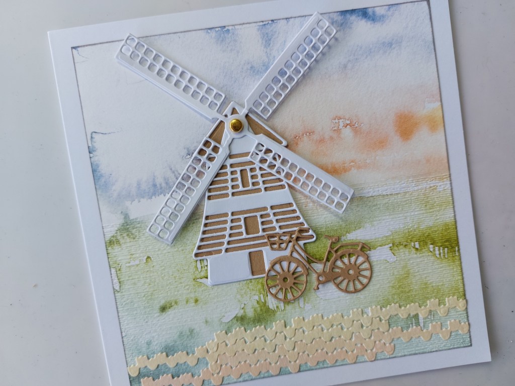 I then set about die cutting! I cut 4 strips of the little tulips from some ombre paper that’s years old, and glued them across the bottom of the card. I cut the windmill base & the bicycle out of kraft card, with the windmill front & sails in white. Having glued the windmill pieces together, I attached the sails with a gold brad (my ‘something shiny’ for AYSI) and then attached it to the card front. The bicycle went in front of the windmill, again glued into place – our cyclist is off having a quick picnic in the field!