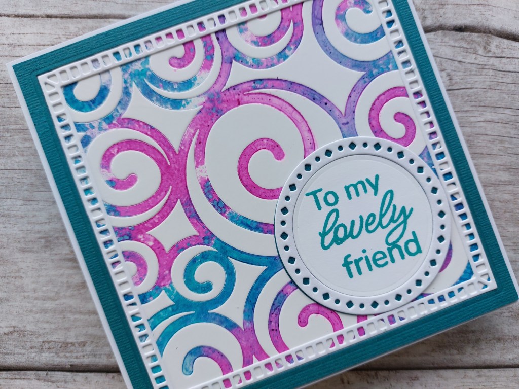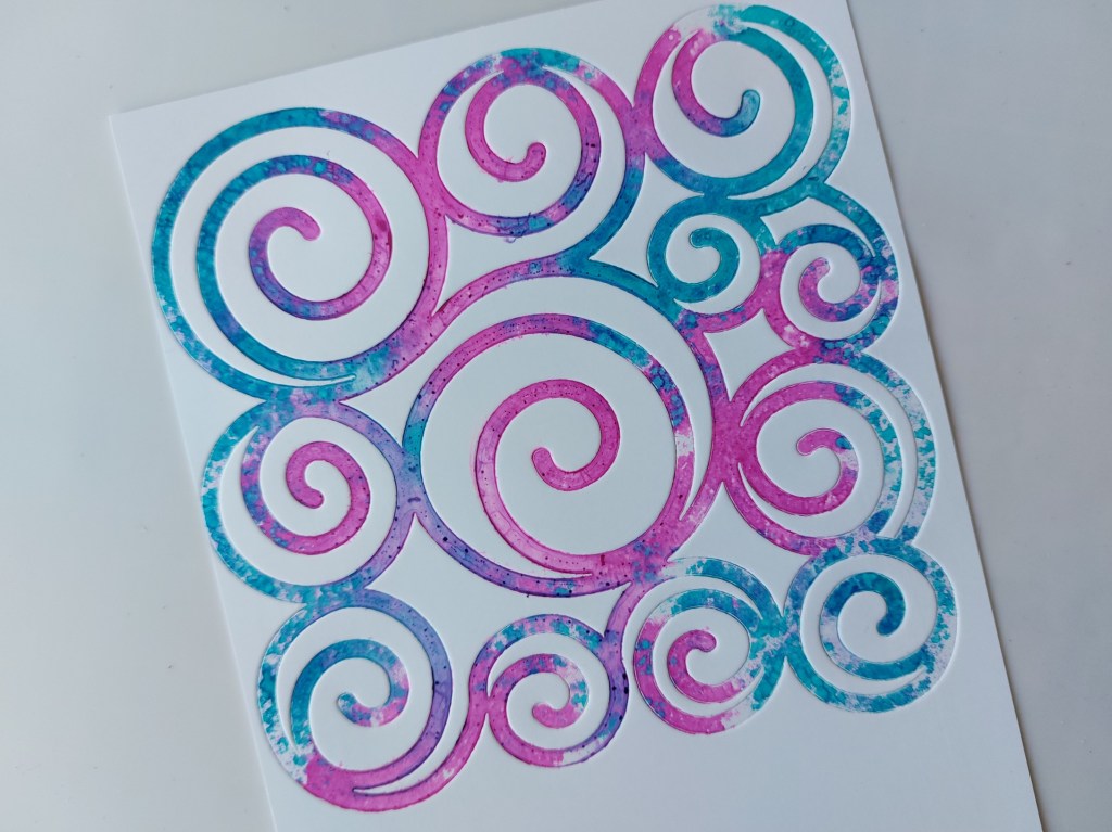 I started with the swirly stencil from the Craft Club, laid it on my gel plate and dabbed ‘wild plum’ and ‘stream’ alcohol inks over it using felt dabbers. I then sprayed a piece of Clarity’s coated card stock with alcohol blending solution, laid the inky stencil on it and ran it through my Gemini embosser. If you want more detail on how to do this, Clarity have a great YouTube video here