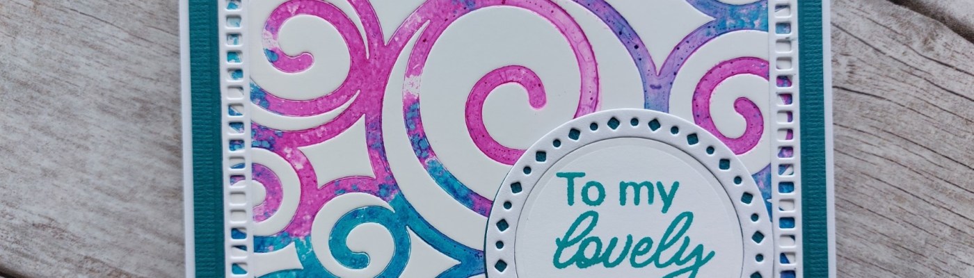 I started with the swirly stencil from the Craft Club, laid it on my gel plate and dabbed ‘wild plum’ and ‘stream’ alcohol inks over it using felt dabbers. I then sprayed a piece of Clarity’s coated card stock with alcohol blending solution, laid the inky stencil on it and ran it through my Gemini embosser. If you want more detail on how to do this, Clarity have a great YouTube video here