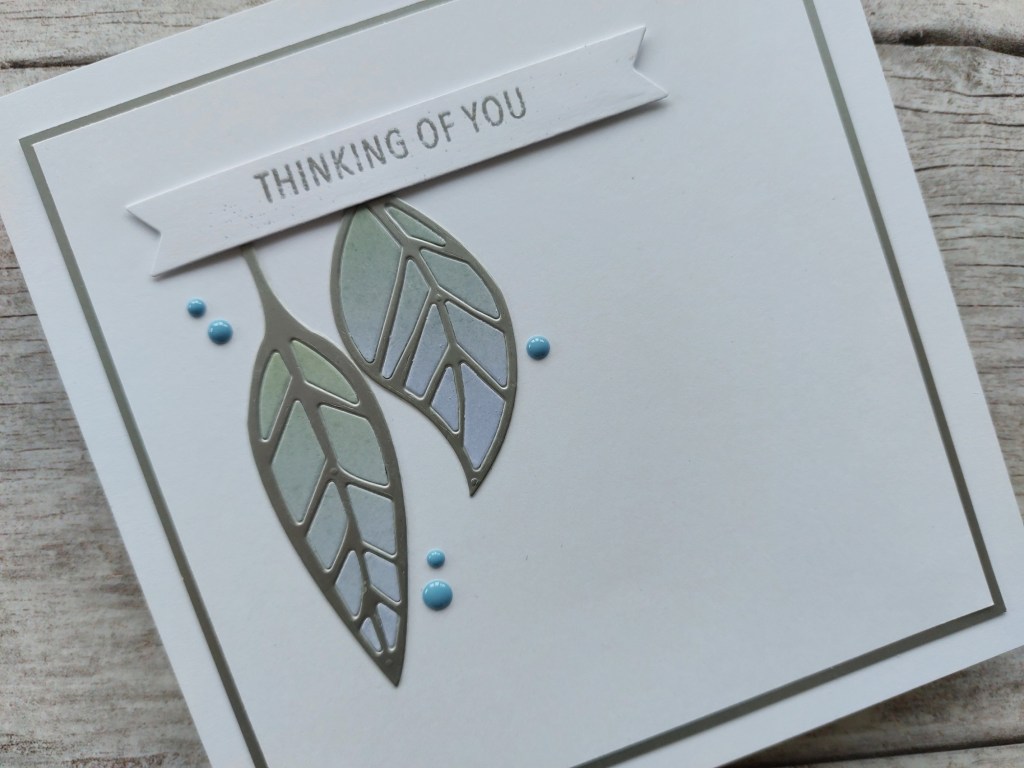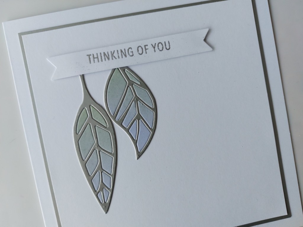 I blended Distress Oxides in ‘iced spruce’ & ‘shaded lilac’ onto a scrap of card and then recut the leaves. I pieced the waste bits into the leaves, which gives a lovely graduation on the colours (and also gives me two other leafy outlines for another card!). I stamped the sentiment onto a die cut banner, heat embossed it in silver and attached it across the to of the leaves.