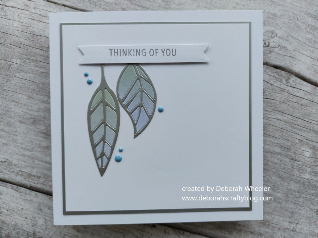 I started by diecutting the two smaller leaves in the set, and attached them to a 6×6 card blank to which I’d already added a layer of white card mounted on silver.