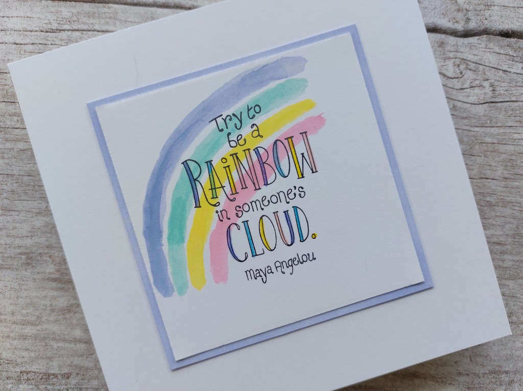 I stamped the Maya Angelou quote in the middle of the card square, and then coloured in the letters with Pergaliner pencils, following the palette from the rainbow.