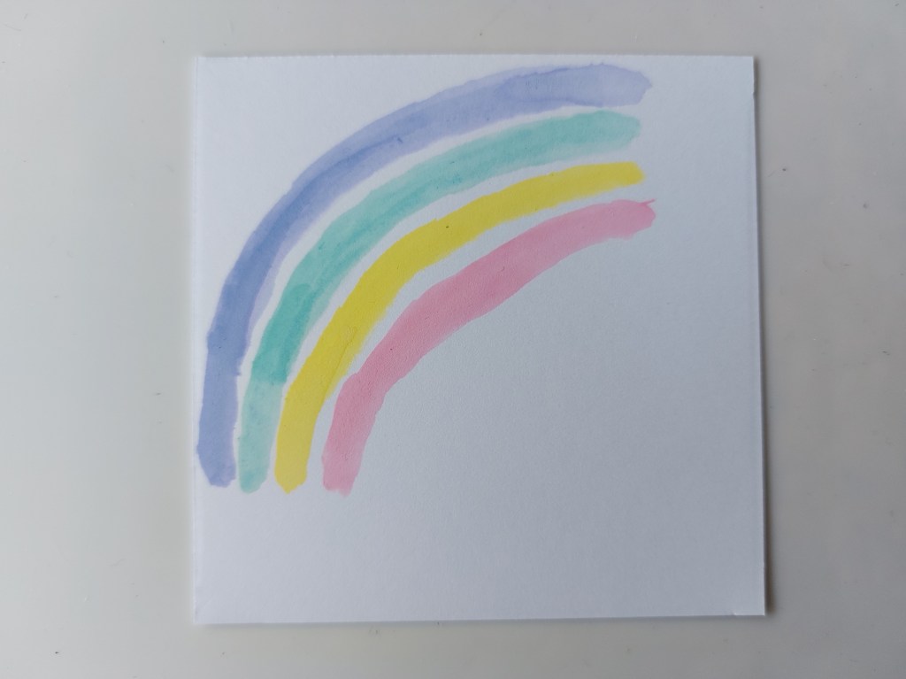 I painted my rainbow onto a small square of card using Distress Oxides in ‘shaded lilac’, salvaged patina’, ‘squeezed lemonade’ and ‘kitsch flamingo’.
