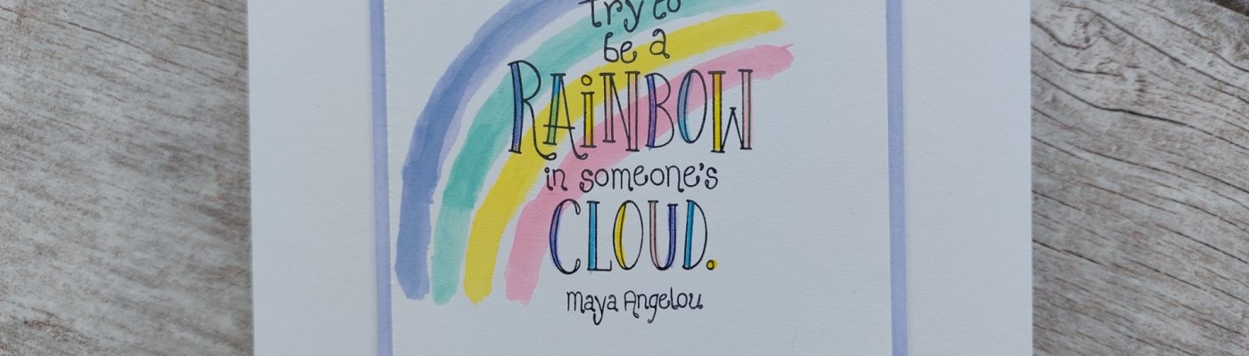 I stamped the Maya Angelou quote in the middle of the card square, and then coloured in the letters with Pergaliner pencils, following the palette from the rainbow.