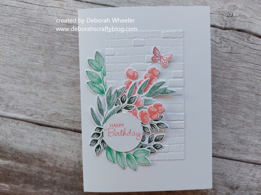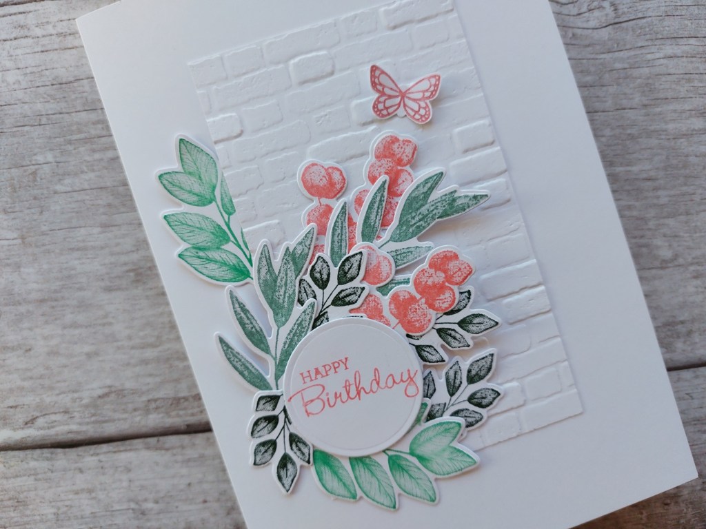 I started by embossing a piece of card with my favourite SU folder – the ‘bricks & mortar’ (it makes the best background I think!). I stamped and cut one of the leafy sprays from ‘forever fern’ using ‘shaded spruce’, attached it down the side of the embossed card and stuck both onto a 5×7 card blank.