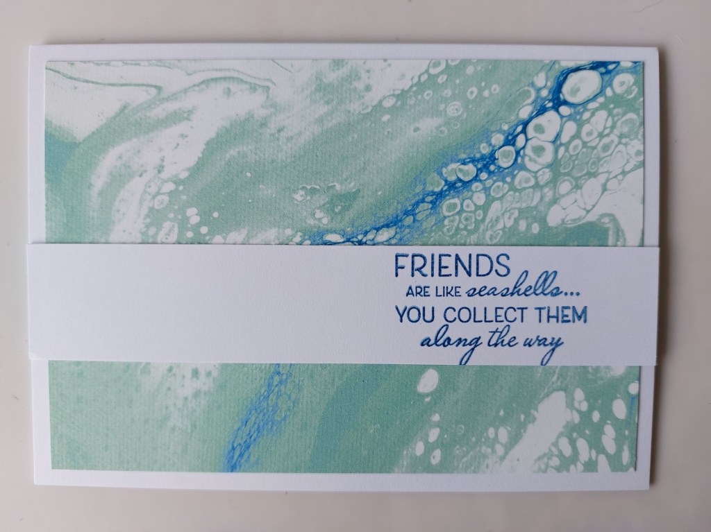 I started by attaching a piece of the SU ‘waves of the ocean’ to an A6 card blank. I stamped the sentiment onto a strip of white card using ‘cobalt’ Archival ink and added that to the card front.