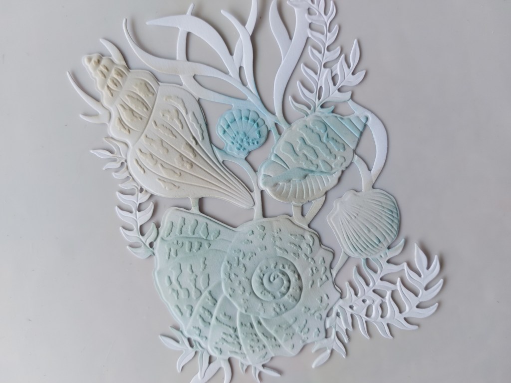 I cut the ‘seaside seashells’ die in white card, then ran it through the ‘seashells’ embossing folder before blending ink onto the shells with a brush – I used ‘pumice stone’, ‘antique linen’ and ‘speckled egg’ Distress Oxides.