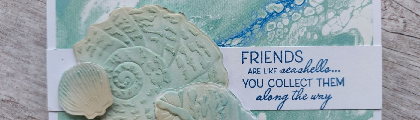 I fussy cut all the shells out of the die cut (as usual, I hadn’t decided which one to use at that point!) I laid them out on the card in various arrangements and in the end went with three of them, using foam pads to attach them.