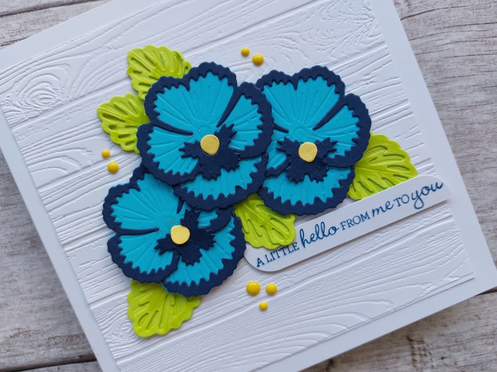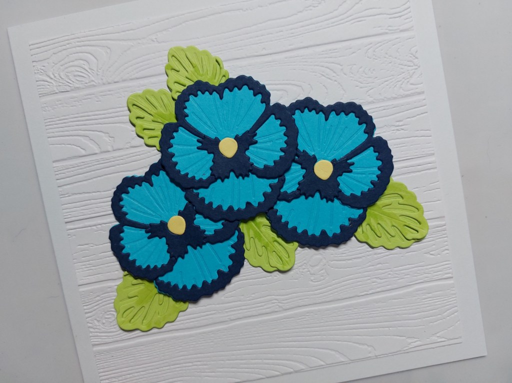 I embossed a square of white card with SU’s ‘pinewood planks’ and attached it to a 6×6 card blank. I grouped the pansies and leaves together and attached them to the card following Atlantic Hearts’ layout.