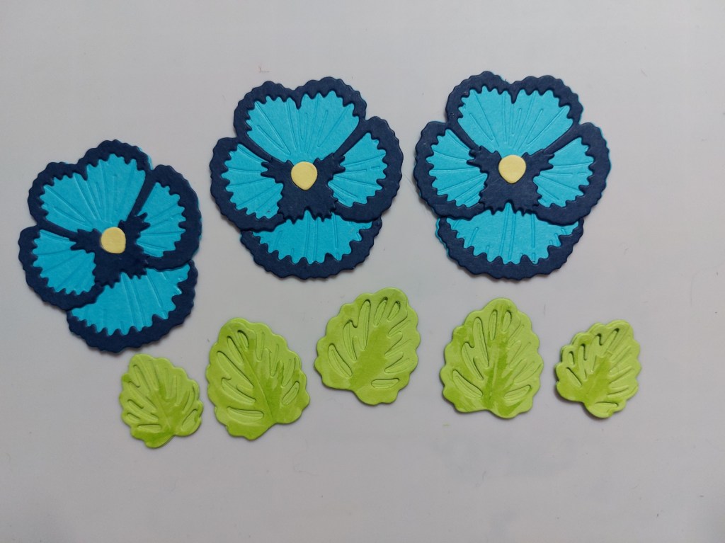I started by die cutting the pansies in ‘tahitian tide’ & ‘night of navy’ card, the centres in ‘daffodil delight’ & the leaves in ‘parakeet party’. I added a little shade to the leaves by brushing ‘parakeet party’ ink across them with a waterbrush, and then glued everything together.