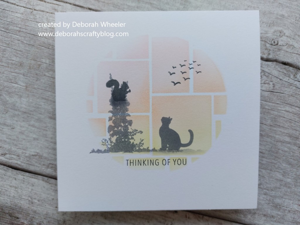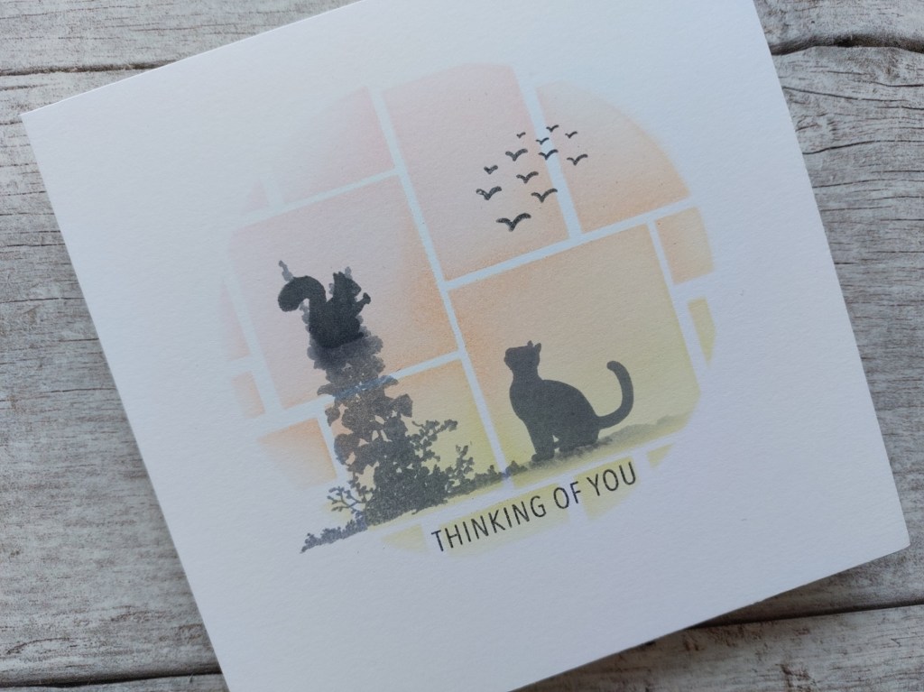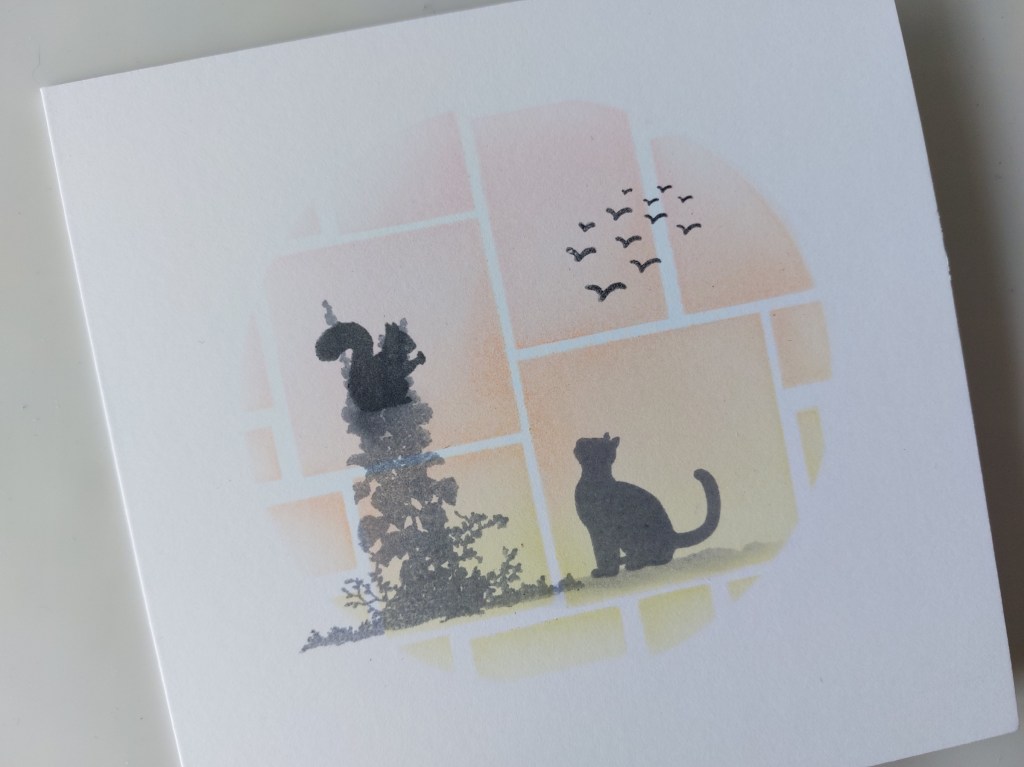 I then stamped the shrub, cat and squirrel from the ‘birdhouse garden’ set using ‘shadow grey’ Archival ink, together with the flock of birds. I was using my stamping platform, so was able to double stamp the squirrel, to give him a darker tone against the shrub. I added the ground under the cat by sponging the ‘shadow grey’ along the edge of a torn piece of copy paper, and sponged a little under the squirrel to soften the line against the plants.