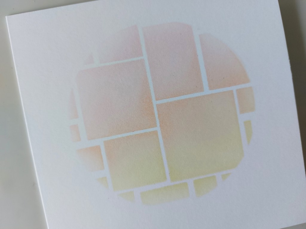 I started by lining up Clarity’s ‘abstract squares’ stencil on a 6×6 card blank, and then fixed the circle stencil over it. I blended the three colours into the aperture to give me the background, using ‘willow’ & ‘salmon’ Adirondacks and ‘spun sugar’ Distress Ink.