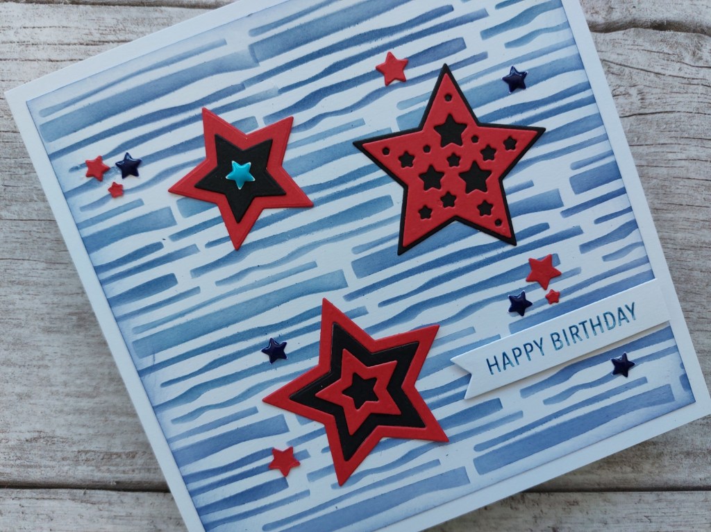 Hello there. I needed a boy’s birthday card so turned to Julie Hickey’s star dies as the focus for the card. I took the layout from the sketch over at As You See It (swapping the circles for stars), together with the colours from Color Hues, adding in their optional theme of ‘stars & stripes’. I also included three elements from Festive Friday‘s inspo list (stripes, black & enamel embellishments) and will be sharing this with Happy Little Stampers‘ stencil challenge.