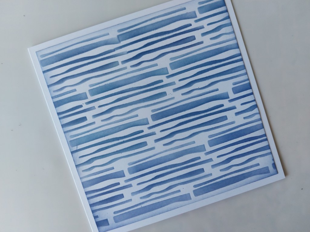 That’s quite a list! I started with a square of white card and blended ‘chipped saphhire’ Distress Oxide through the small stripes on Julie’s ‘fern foliage’ stencil, repeating it until the card was covered. That then went onto a 6×6 card blank.