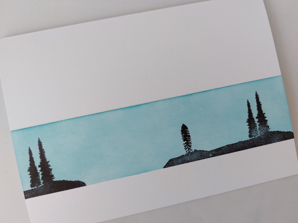 I started with a panel of white card, blended ‘broken china’ Distress Oxide onto it and then stamped the tree landscape in black Archival. I attached it to a 5×7 card blank.