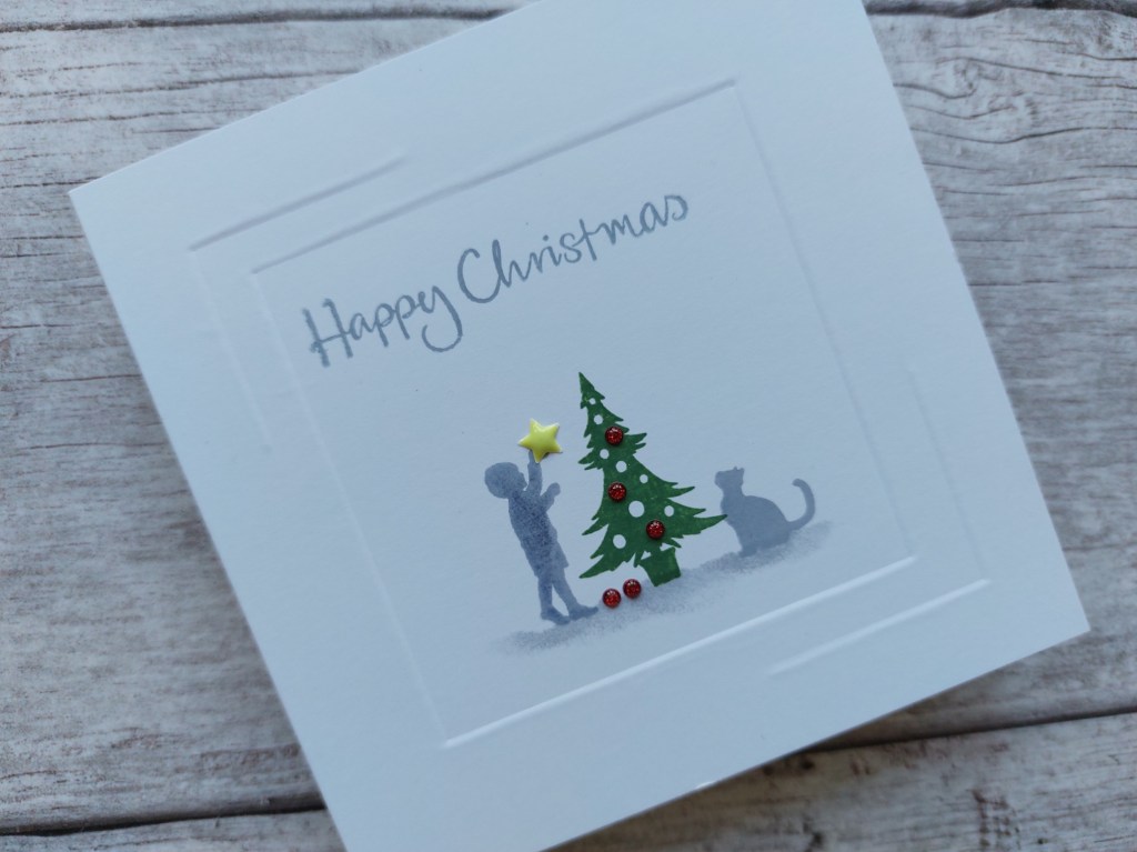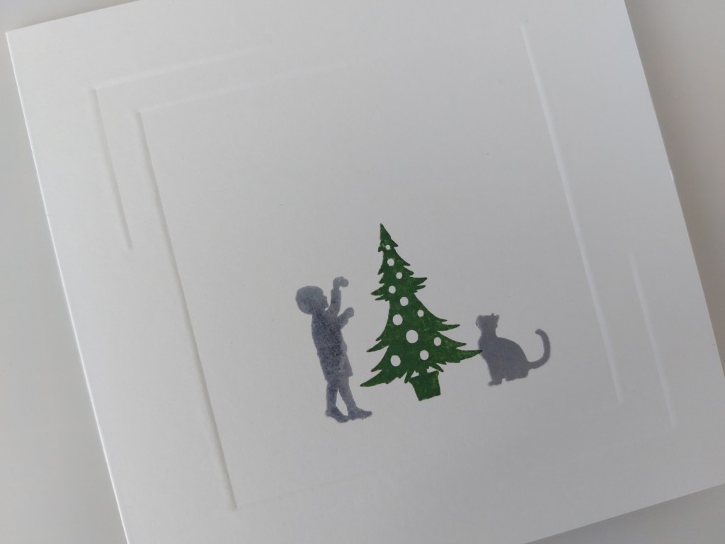 I stamped the tree from the ‘wee folk Christmas’ set in ‘rustic wilderness’ Distress Oxide and the small boy in ‘shadow grey’ Archival. I added the cat from the ‘garden miniatures’ set on the other side fo the tree, again in ‘shadow grey’.